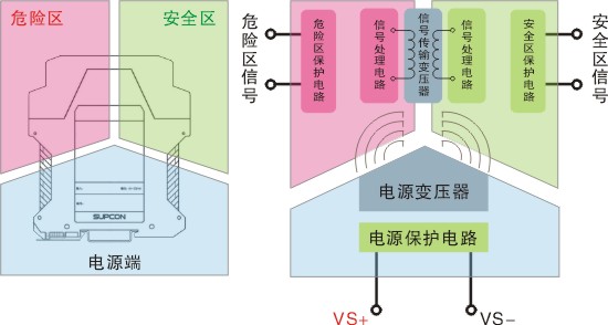 SB3000-Ex系列隔離柵通過光、電、磁等隔離技術對供電電源、輸入端信號和輸出端信號三者進行兩兩隔離,從而實現現場設備和控制系統之間的隔離信號傳輸,是現場設備和控制室設備間的隔離接口單元。